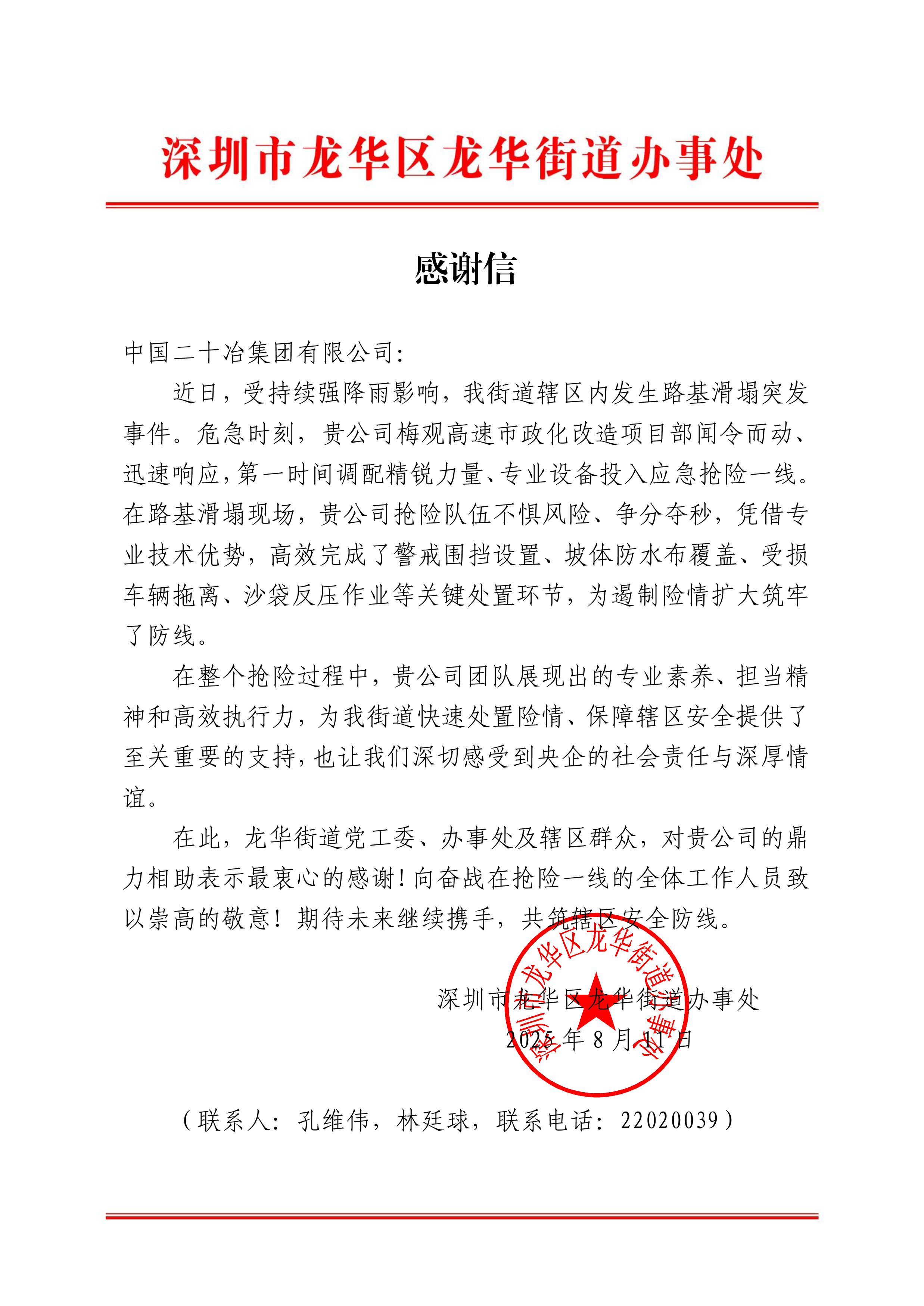 8月13日,深圳二十冶梅觀高速項目收到深圳市龍華區龍華街道辦事處的感謝信。